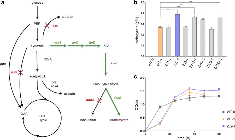 CRISPR/Cpf1是继CRISPR/Cas9之后被开发出来的基因组编辑系统。与CRISPR/Cas9相比,CRISPR/Cpf1脱靶率更低且所需的核酸酶和RNA分子更小,因此在基因组编辑领域具有巨大的应用潜力。然而,编辑效率相对较低限制了CRISPR/Cpf1基因编辑系统的应用。谷氨酸棒杆菌是一种重要的工业生产菌株,此前,研究者利用CRISPR/Cpf1在谷氨酸棒杆菌中进行基因组编辑的效率低于15%,且无法利用线性DNA作为修复模板。因此,该课题组针对谷氨酸棒杆菌的基因组编辑对CRISPR/Cpf1系统进行了系统的优化,优化参数包括PAM序列、间隔序列的长度、修复模板的类型。利用优化后的CRISPR/Cpf1系统在谷氨酸棒杆菌中进行基因组编辑的效率显著提高,且可以利用线性DNA作为修复模板。随后,该课题组利用优化后的CRISPR/Cpf1系统对野生型谷氨酸棒杆菌进行遗传改造,通过敲除基因 pyc 、 ldh 和 adhA 成功地提高了异丁酸的产量(图2)。相关成果发表于《Microbial Cell Factories》,原文链接:https://doi.org/10.1186/s12934-019-1109-x