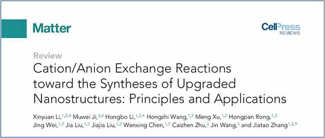 近日,ob真人化学与化工学院院长张加涛团队在Cell旗下材料学旗舰期刊《Matter》上发表了题为《Cation/Anion Exchange Reactions towards the Syntheses of Upgraded Nanostructures: Principles and Applications》的综述文章(Matter 2020, 2, 554-586),基于团队在离子交换策略精准合成II-VI族掺杂及异质纳米晶及应用方面研究成果,详细介绍了合成无机纳米晶的离子交换反应的反应机理、材料合成进展、性能应用和展望。