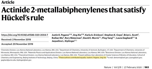 近日,ob真人化学与化工学院引进的特立青年学者谢静教授在《Nature》杂志上合作发表题为“Actinide 2-metallabiphenylenes that satisfy Hückel’s Rule”(符合“休克尔定律”的锕系金属取代亚联苯化合物)的文章(Nature 2020, 578, 563-597), 锕系金属让芳香性和反芳香性环共存。谢静教授为该论文的共同第一作者,负责完成论文的理论计算部分,此研究是与美国洛斯阿洛莫斯国家实验室Jaqueline L. Kiplinger课题组以及美国明尼苏达大学Laura Gagliardi教授合作完成。