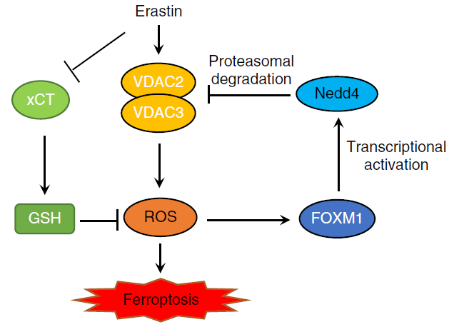 本研究发现erastin通过诱导ROS应答转录因子 FOXM1 激活神经元前体细胞表达发育下调 4(Nedd4)的表达。Nedd4是真核生物 HECT 结构域 E3 连接酶家族的重要成员,在进化过程中保持保守性。Nedd4 通过其WW结构域与VDAC2/3的PPxY序列结合并促进VDAC2/3降解,从而降低了癌细胞对 erastin 的敏感性。通过抑制Nedd4和FOXM1的表达,以减少VDAC2/3蛋白质降解的方法,可以增加癌细胞对erastin的敏感性。该项研究阐明了一种基于FOXM1-Nedd4-VDAC2/3负反馈回路,揭示了肿瘤细胞如何适应新的小分子药物并维持细胞内稳态的分子机制,并提示了以Nedd4作为靶标治疗,通过细胞铁死亡治疗肿瘤的新思路。