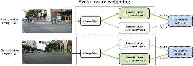 论文针对不同尺度的行人目标存在不同的特征模式、输入目标尺度变化导致的类内差异会极大增加目标检测模型的学习难题和挑战,提出了对不同尺度的目标采用“分而治之”的策略,在共享底层共有特征以保证计算效率的同时,运用专属网络分支分别捕获不同尺度目标的特有高层特征,并进行独立预测和尺度自适应融合,增强了模型对于输入尺度变化的鲁棒性。该方法简单易行,可有效应用于真实 复杂场景下的行人检测。更为重要的是,该方法为提高检测模型对于输入变化的鲁棒性提供了一种有效的实用性新思路,被广泛借鉴和应用于计算机视觉领域的其他各种任务中。