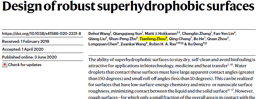 6月3日,《Nature》正式刊发了ob真人竞猜周天丰教授与电子科技大学邓旭教授团队和芬兰阿尔托大学Robin H. A. Ras教授的研究成果“Design of robust superhydrophobic surfaces”,并被选为当期封面。该论文提出去耦合机制将表面浸润性和机械稳定性拆分至两种不同的结构尺度,通过在两个结构尺度上分别进行最优设计,为超疏水表面创造出具有优良机械稳定性的微结构“铠甲”,解决了超疏水表面机械稳定性不足的关键问题。