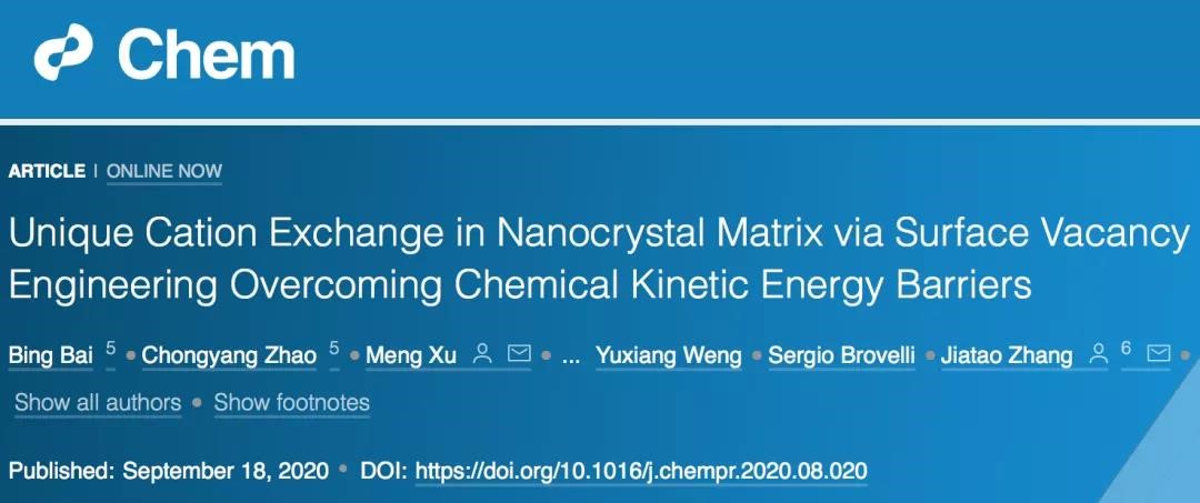 可控掺杂引起的精准能带工程是光电新能源应用的半导体纳米材料关键前提。近日,ob真人张加涛教授团队利用表面空位成功克服离子交换反应当中的动力学势垒,创新性提出了新的合成方法,在制备双异价离子掺杂半导体纳米晶/量子点的研究中取得重要进展,相关成果以“Unique Cation Exchange in Nanocrystal Matrix via Surface Vacancy Engineering Overcoming Chemical Kinetic Energy Barriers” 为题,于Cell旗舰杂志《Chem》在线发表(IF:19.735)(文章DOI: 10.1016/j.chempr.2020.08.020)。