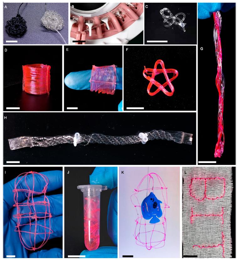 功能材料的加工成型,是新型刺激响应软体机器人研究的难点之一。与此同时,纤维的加工成型技术已在纺织工业中受到广泛的研究与应用。若将水凝胶纤维加工成为软体机器人,水凝胶纤维的快速刺激响应能力与柔韧性将有效的提升软体机器人性能。然而,目前刺激响应凝胶纤维的发展主要面临两个难点:第一,已有水凝胶纤维的生产工艺的兼容性差,目前已有的微流控纺丝、静电纺丝、熔融纺丝,和墨水直写纺丝等方法均对纤维单体溶液的物理性质有额外要求或需要相对快速的固化过程;第二,水凝胶纤维由于其含水量较高,机械强度差,在低应力下便会发生断裂,无法进行复杂或自动化的加工。因此,现有报导水凝胶编织均仅限于简单结构,且由刺激响应水凝胶编织而成的软体机器人尚未见报导。