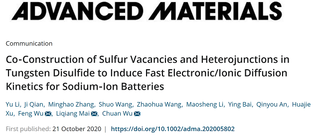 近日,ob真人材料学院吴锋院士团队在钠离子电池材料的结构设计和性能优化方面取得重要突破。材料类国际顶级期刊《Advanced Materials》(《先进材料》,影响因子27.398)以“Co-Construction of Sulfur Vacancies and Heterojunctions in Tungsten Disulfide to Induce Fast Electronic/Ionic Diffusion Kinetics for Sodium-Ion Batteries”为题在线报道了这一研究进展。该工作由吴锋院士团队的吴川教授课题组完成,ob真人材料学院博士后李雨为第一作者,ob真人吴锋院士、吴川教授和武汉理工大学麦立强教授为共同通讯作者(文献链接:https://onlinelibrary.wiley.com/doi/10.1002/adma.202005802)。