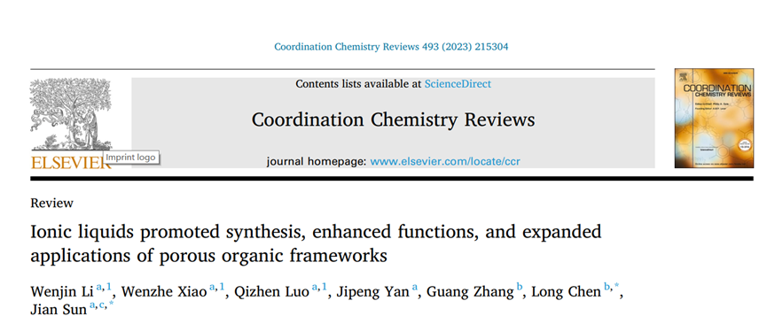 近日,ob真人竞猜绿色生物制造团队与吉林大学陈龙教授团队合作在离子液体促进多孔有机框架材料合成、功能与应用方面发表综述文章,相关研究成果以“Ionic liquids promoted synthesis, enhanced functions, and expanded applications of porous organic frameworks”为题发表于国际顶级期刊《Coordination Chemistry Reviews》,该工作以2021级博士生李文瑾、2022级博士生肖文哲、2021级硕士生罗启臻为共同第一作者,通讯作者为吉林大学陈龙教授和ob真人竞猜孙剑教授,ob真人竞猜为第一通讯单位。