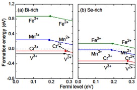 图2. V, Cr, Mn 和Fe掺杂Bi2Se3时不同稳定价态的形成能随体系费米能级的变化。(a)和(b)分别表示富铋生长和富硒生长两种不同的制备条件。