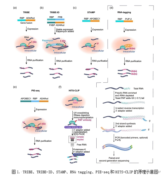 RNA结合蛋白(RNA-binding proteins,RBPs)是生物体内强有力的多功能调节因子,通过在多个水平上调节基因表达,在生物体发育、代谢和各种疾病中发挥重要作用。对RBP功能深入研究的需求,推动了RBP-RNA相互作用检测方法的快速发展。近年来,将RNA修饰酶(RNA modification enzymes,RME)与感兴趣的RBP融合的检测方法开发成为一个热门研究方向。该文章综述了包括作用于RNA的腺嘌呤脱氨基酶ADAR、末端核苷酸转移酶TENT和激活诱导的胞嘧啶脱氨酶/载脂蛋白B mRNA编辑酶催化多肽样(AID/APOBEC)蛋白家族脱氨酶在内的,RNA修饰酶的生物学功能、生物化学活性和来自于酶自身与其结构域和伴侣蛋白的底物特异性。同时,讨论了RNA修饰酶活性筛选系统,以及具有工程酶活性的RNA修饰酶突变。此外,文章提供了基于RNA修饰酶和基于交联和免疫纯化(CLIP)的RBP靶标检测策略的基本原理、优缺点和应用的系统概述,包括基于A-G的RNA编辑酶鉴定RNA结合蛋白靶标的TRIBE(Targets of RNA-binding proteins Identified By Editing)、基于RNA加尾酶的方法RNA Tagging、C-U的RNA编辑酶APOBEC1介导的编辑靶标分析技术STAMP(Surveying Targets by APOBEC-Mediated Profiling)、CLIP-seq及其衍生技术 (图1)。