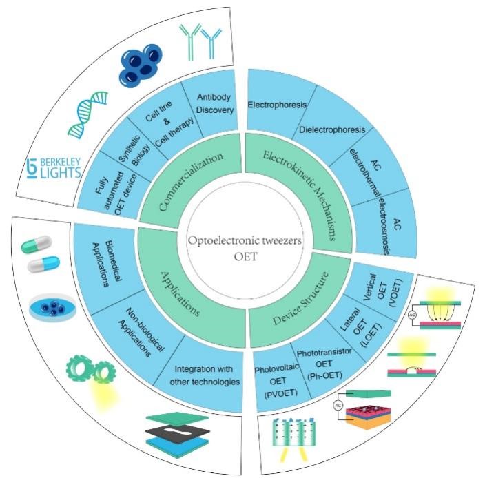 图1. 光电镊技术四个方面的介绍,包括技术原理、器件结构、应用场景及技术转化