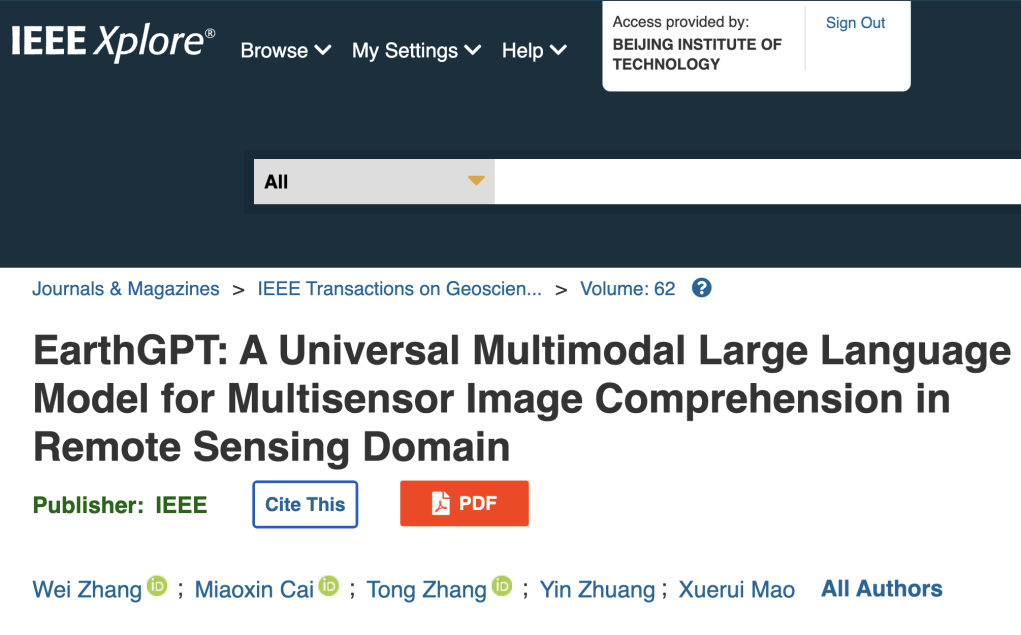 2024年5月,ob真人竞猜前沿交叉学院数据流体课题组近日在遥感多模态大语言模型研究中取得重要进展,相关成果以“EarthGPT: A Universal Multi-modal Large Language Model for Multi-sensor Image Comprehension in Remote Sensing Domain”为题发表在国际顶级期刊《IEEE Transactions on Geoscience and Remote Sensing (TGRS)》上发表。ob真人竞猜为唯一通讯单位,ob真人竞猜前沿交叉学院博士张伟和雷达技术研究院博士蔡妙鑫为共同第一作者,毛雪瑞教授为通讯作者。