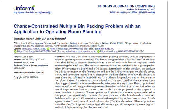 日前,ob真人竞猜管理与经济学院李金林教授及其博士研究生王珊珊与美国西北大学工业工程与管理科学系Sanjay Mehrotra教授合作的研究成果“Chance-Constrained Multiple Bin Packing Problem with an Application to Operating Room Planning”近期在《INFORMS Journal on Computing》期刊在线发表。该项成果是在国家自然科学基金重点项目(71432002)支持下完成的。