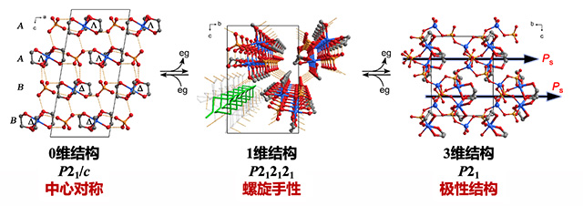 该课题组在前期通过分子指向变化调控材料力、磁物理性质等相关工作的研究基础上( Nat. Chem. , 2014, 6, 1079-1083; Nat. Commum. 2019, 10, 4805-4812; Angew. Chem., Int. Ed. 2017, 56, 717-721),结合近期通过客体分子诱导晶格变化的相关报道,提出通过剥离弱螯合配体驱动单晶到单晶转变的研究思路,获得了首例基于简单螯合配体脱离、晶体结构缩合诱导的巨大并且可逆的单晶到单晶转变。通过乙二醇螯合配体的两步脱离/吸附,该材料体积可逆伸缩高达50%,质量可逆交换36%,体积与质量变化均达到目前文献报道单晶到单晶转变的最大值。同时螯合配体脱离过程中,金属中心相邻配位点空间释放,分子手性发生反转,对应单晶材料经历中心对称—螺旋手性结构—极性结构的两步可逆对称性变化。该对称性变化通过单晶X-射线衍射、变温二阶非线性光学以及CD光谱进行了详细的表征。通过比照单晶结构对称性的转变,作者对该结构变化的分子运动机理进行了深入的分析。这种具有类凝胶性质的单晶材料为柔性分子基单晶材料的合成提供了新的思路,同时基于螯合配体脱离驱动的分子手性变化为新型手性配合物的合成提供了可能的途径。