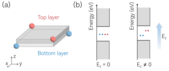 图4. (a) 单层TiSiCO纳米盘的限域能随体系尺寸变化。(b) n="7的单层TiSiCO纳米盘在不同电场下的能级。