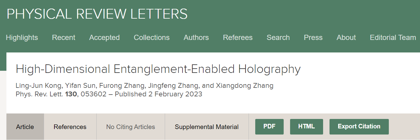 近日,ob真人物理学院张向东教授课题组基于高维轨道角动量纠缠态,实现了高维量子全息和图像安全加密。相关成果以“High-dimensional entanglement-enabled holography”为题发表在国际物理学顶级学术期刊《物理评论快报》[Phys. Rev. Lett. 130, 053602 (2023)]上。ob真人物理学院孔令军研究员、孙亦凡副研究员为该论文的共同第一作者,ob真人物理学院张向东教授为论文通讯作者,ob真人物理学院张福荣博士、张景风博士也为该工作做出了重要贡献。该研究工作得到了国家自然科学基金委的大力支持。