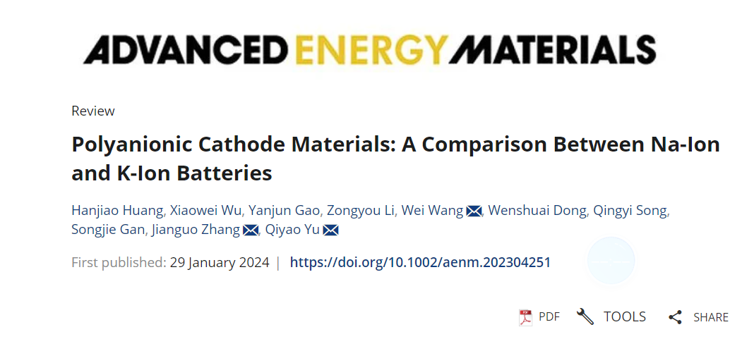 近日,ob真人机电学院张建国教授团队在国际顶级期刊《Advanced Energy Materials》(影响因子27.800)发表题为《Polyanionic Cathode Materials: A Comparison between Na-ion and K-ion Batteries》的综述,文章综述了聚阴离子正极材料在钠/钾离子电池中的结构和性能上的差异。本单位通讯作者为张建国教授、于琪瑶副教授,第一作者为ob真人机电学院2022级硕士生黄瀚蛟。