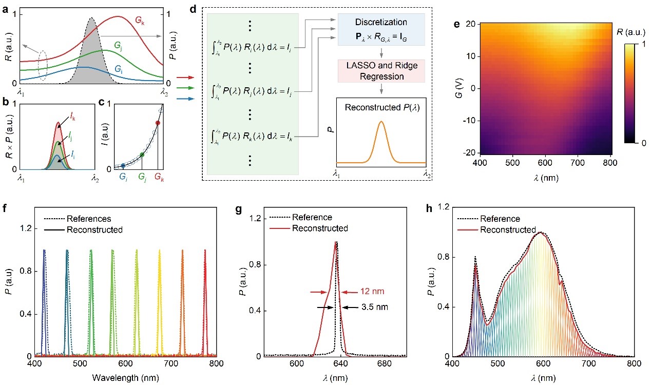 图1. 范德华光谱仪的设计原理及光谱重构功能展示