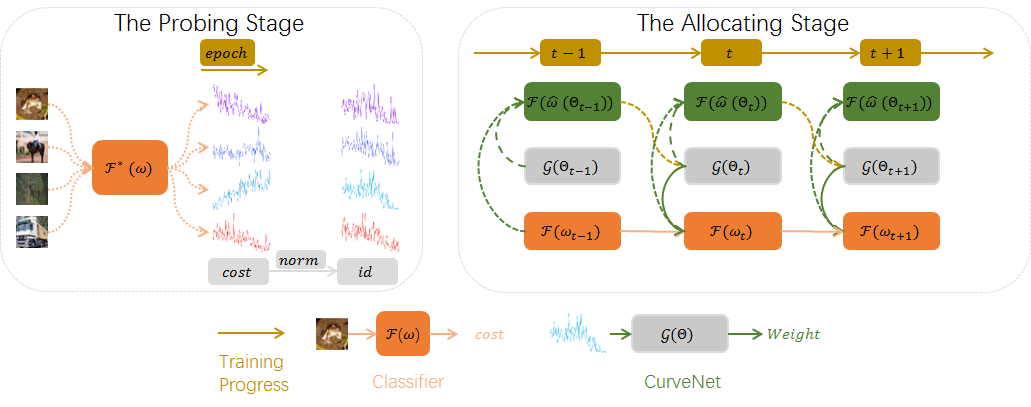在此基础上,科研团队提出了损失值曲线的噪声和长尾数据处理模型。如图2,基于损失值曲线的噪声和长尾数据处理模型可以被分为两个阶段: Probing Stage和Allocating Stage。在Probing Stage先训练一遍模型,得到每个样本的损失值曲线;在Allocating Stage将损失值曲线作为样本的一项特征输入至权重生成模型并为每个样本生成权重,采用元学习方法进行了优化。