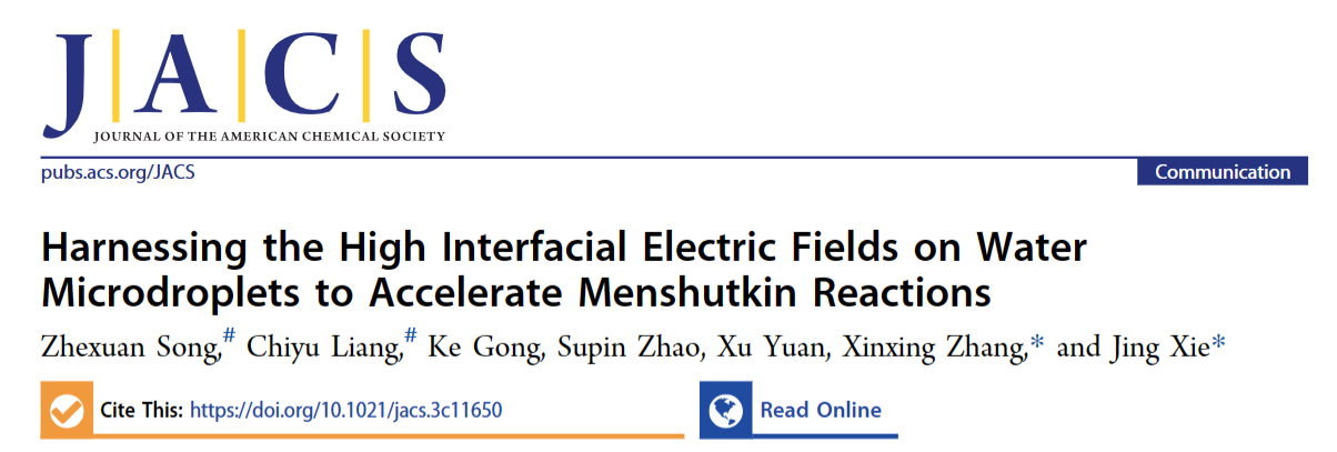 近日,ob真人竞猜化学与化工学院谢静教授团队和南开大学张新星教授团队合作,在微液滴加速有机化学反应方面取得进展。相关研究成果以“Harnessing the High Interfacial Electric Fields on Water Microdroplet to Accelerate Menshutkin Reactions”为题发表于国际权威期刊《Journal of the American Chemical Society》。ob真人竞猜谢静教授和南开大学张新星教授为论文共同通讯作者,ob真人竞猜为第一单位。该研究课题得到了国家自然科学基金项目、ob真人竞猜特立青年学者项目等资助。
