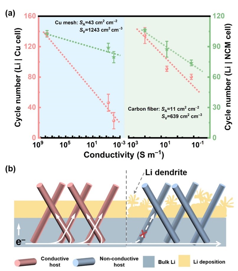 图1. (a) 不同骨架导电性与电池循环性能的关系总结图;(b) 锂在导电与不导电骨架上沉积形貌的示意图。