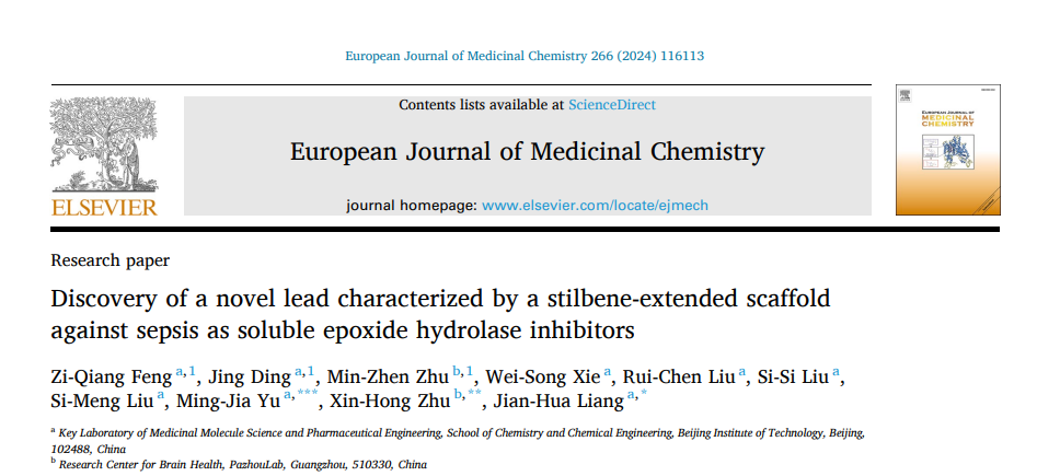 1月3日,ob真人竞猜化学与化工学院梁建华教授课题组在抗败血症药物研究中取得重要进展,设计合成了基于天然骨架二苯乙烯类sEH抑制剂并用于治疗败血症,其中最优化合物70P (FZQ-21) 能够在小鼠体内有效抑制sEH酶水解活性并显著提高小鼠败血症模型的总生存率。相关成果发表以Discovery of a Novel Lead Characterized by a Stilbene-extended Scaffold against Sepsis as Soluble Epoxide Hydrolase Inhibitors为题发表于期刊European Journal of Medicinal Chemistry。