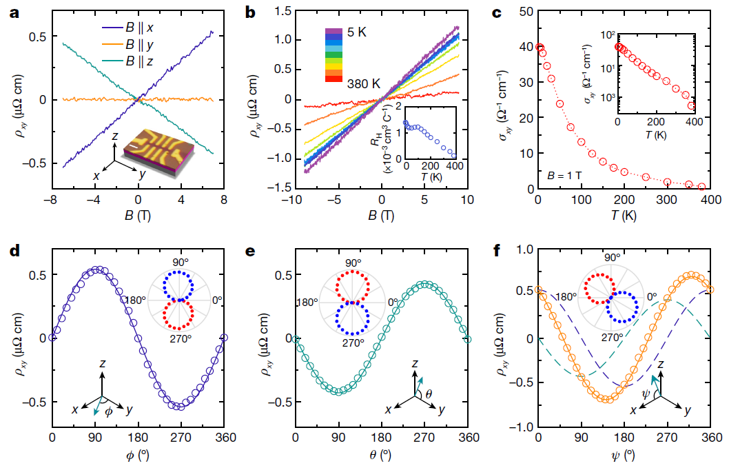 如图4b所示,不同温度下的输运实验进一步表明,IPHE在室温下仍然存在 (实验最高温度为380 K)。在室温时,IPHE的霍尔系数为0.44 × 10−3 cm3 C−1,仍然比面外霍尔效应大。图4c展示了面内霍尔电导率随温度呈指数衰减,据此可得出约8 meV 的带隙。角度依赖的霍尔效应研究如图4d-f所示。当磁场在z-y面内旋转时,由于存在面外磁场分量,而面内分量B||y不贡献,与通常的霍尔效应一样,霍尔电阻率呈现出正弦曲线。当磁场在x-y面内旋转时,霍尔电阻率在B||x时最大,在B||y时消失,整体也呈现出简单的正弦曲线。当磁场在z-x面内旋转时,结果显示为相移后的正弦曲线,它可以被准确的分解为面内霍尔效应和面外霍尔效应。这些角度依赖的霍尔输运结果表明,IPHE只正比于磁场在x方向的投影。