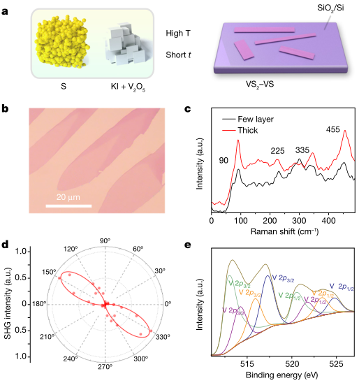 图1 VS2-VS超晶格生长过程和光学图像。a, VS2-VS的生长过程。b, VS2-VS 超晶格薄片的光学图像。c,不同厚度的VS2-VS超晶格的拉曼光谱。d, VS2-VS中SHG强度随角度的变化曲线。e, VS2-VS超晶格中V 2 p 的XPS光谱。