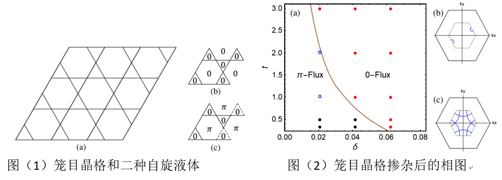 已故的凝聚态物理学创始人之一、诺贝尔物理奖获得者P. W. Anderson曾有一个非常著名的理论:当一个量子自旋液体态被掺杂入自由载流子之后,将变成为非常规超导。量子自旋液体是一类特殊的自旋体系,这些体系当温度一直降到零温都不进入磁有序和其它自发对称破缺相,从而超出Landau关于物态的一般框架。Anderson指出在这类态中,自旋相反的电子之间天然已经形成了配对,只是由于缺乏自由载流子,从而为莫特绝缘体。此时,任意的掺杂将导致超导态的出现。Anderson的理论虽然深刻而合理,但长久以来未能在一个真实的实际材料或者简单的模型体系中实现。1973年和1987年,Anderson分别提出三角晶格和正方晶格海森伯模型的自旋液体基态;其中后者被认为掺杂后导致高温超导。后来,该二模型体系均被多种数值计算结果判定为磁有序态,从而无法实现自旋液体。然而,近年来涌现出一个倍受关注的新自旋体系,ZnCu3(OH)6Cl2。该体系具有Kagome晶格(也称笼目晶格),如下图(1)所示。各方面实验显示该体系可能为自旋液体。理论上,国际多个研究组的不同数值结果也支持量子自旋液体基态。其中可能性最大的态可以用图(1)中的投影 π -通量态近似描述。然而,对于该体系在掺杂后会形成何种超导态,此前尚未有系统深入的研究。