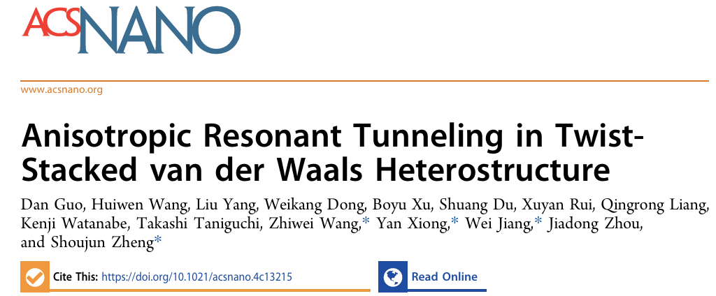 鉴于此,ob真人郑守君研究员、蒋伟教授、王秩伟教授和熊嫣博士共同合作在ACS Nano在线发表“Anisotropic resonant tunneling in twist-stacked van der Waals heterostructure”的研究成果。研究者通过利用扭曲堆叠的1T’二硒化铼设计了一种二硒化铼/六方氮化硼/二硒化铼(ReSe2/h-BN/ReSe2)扭曲堆叠共振隧穿晶体管,表现出ReSe2间扭转角度可调的PVR,并在扭转角度为102°时达到最大。这种对两个ReSe2层之间的扭转角度的强烈依赖性归因于扭转角在隧穿过程中对ReSe2层中两个各向异性带的联合态密度的调节,显著抑制了谷电流,从而增强了PVR,这也得到了理论计算的支持。此外,该器件对温度和520nm光照的敏感性,表明可以通过温度和光照进一步调控PVR,并将其集成到光电应用中。这一发现不仅为通过堆叠工程设计共振隧穿器件提供了一种新方法,还为共振隧穿器件与光电应用的结合提供了可能。