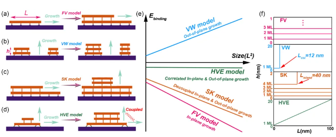 凝聚态物理中新奇物理现象的研究和信息科学中电子器件的制备都极大依赖于高质量薄膜材料的制备。因此,如何在衬底上外延生长出高质量的薄膜材料是凝聚态物理、材料科学和表面化学等众多研究领域中长期存在的一个焦点问题。在长达将近一个世纪的研究基础上,人们逐步总结出三种普适的薄膜生长模型,它们被称之为FV (Frank-van der Merew),VW (Volmer-Weber) 和SK (Stranski-Krastanow) 模型。FV模型描述的是一种面内生长模式。与之相反,VW模型则描述的是一种面外垂直生长模式。SK模型则是介于FV和VW之间的一种生长模式。在已知的这三种生长模型中,面内和面外生长是解耦的,它们可以描述几乎所有已知薄膜材料在衬底上的外延生长过程(图1)。最近,人们发现可以在二维范德华衬底上可以生长出高质量的非范德华氮化物半导体薄膜。这一突破性发现不但开启了一种全新的半导体生长模式,同时也引发了人们对其生长机制的激烈争论。