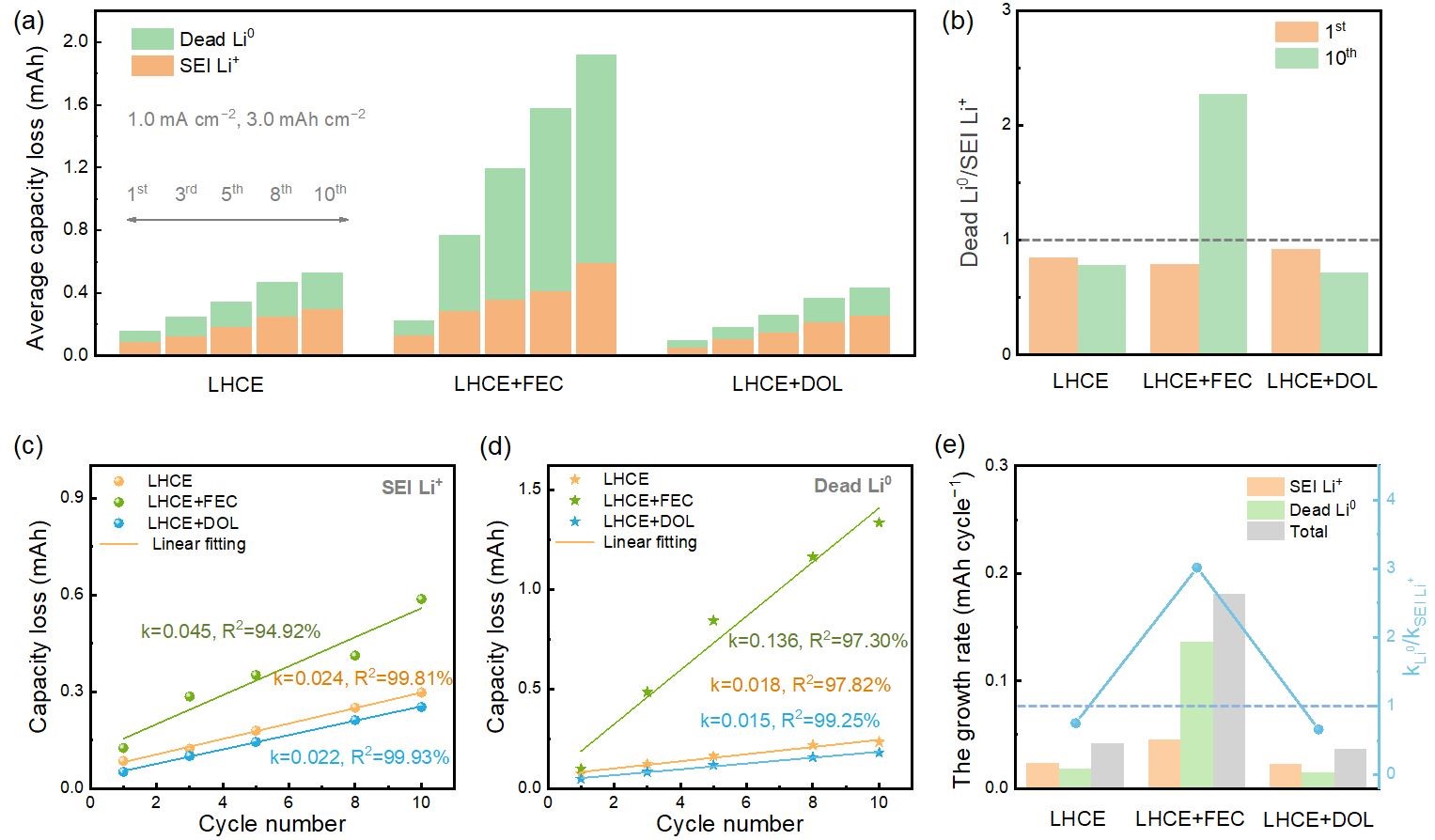 在传统的认知之上,本研究表明由于循环过程中锂电极/电解液界面经历持续的动态演化过程,因此非活性锂损失的主导形式实际上取决于dead Li0和SEI Li+的相对增长速率(kLi0/kSEI Li+)。当采用典型的醚类/酯类柔性成膜添加剂调控原有富无机产物SEI之后,非活性锂表现出不同的增长行为。醚类成膜剂1,3-二氧戊环(DOL) 被发现有助于同时减小SEI Li+和dead Li0的增长速率。