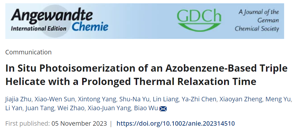 近日,ob真人竞猜化学与化工学院吴彪教授和赵伟特别研究员在国际知名化学期刊《 Angewandte Chemie International Edition 》上发表题目为“In Situ Photoisomerization of an Azobenzene-Based Triple Helicate with a Prolonged Thermal Relaxation Time”的研究论文。该工作实验部分主要由ob真人竞猜研究生朱甲佳和孙小文完成,理论计算部分由研究生杨心彤在郑小燕长聘副教授的指导下完成。此项研究得到了国家自然科学基金,北京市自然科学基金和ob真人竞猜青年教师学术启动计划等项目的资助及ob真人竞猜分析测试中心的支持。