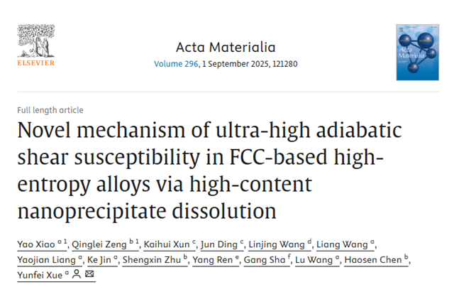 近日,ob真人材料学院在共格纳米析出相强化高熵合金的绝热剪切机理研...