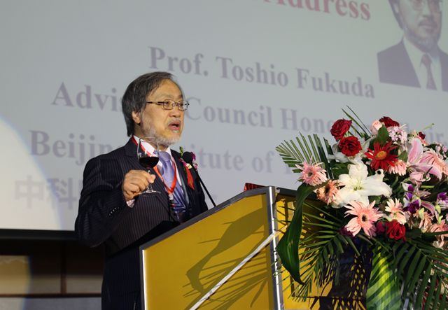 本届大会主席的名誉主席福田敏男教授发表讲话。他对各支持单位和与会人员对大会的支持表示感谢,并鼓励参会的青年学者利用大会契机,积极交流思想和拓展国际视野,为开创机电一体化与自动化技术的新成果奠定基础。会上,柴天佑教授、小管一弘教授、Ken Goldberg教授,杨庆新等教授先后致辞,预祝会议圆满成功,并对与会人员的到来表示欢迎。