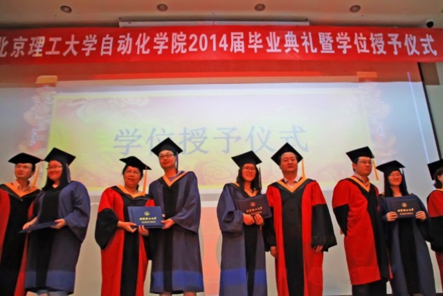 典礼由2010级本科生辅导员潘佳奇主持。首先,自动化学院院长兼党委书记王军政教授代表学院致辞,他对学院2014届圆满完成学业的258名本科生、55名硕士生、17名博士生顺利毕业表示热烈祝贺,对为培养学生付出辛勤劳动的学院教师们表示衷心的慰问,对关心关怀学生成长和支持学院各项工作的学生家长和校友们表示衷心的感谢!王院长也对即将毕业的同学们提出了几点期望:一是永远保持高尚的品德。要有社会责任感和良好价值观,要有报效祖国感恩父母的爱心,要有勤奋刻苦努力拼搏的决心,要有坚持不懈实现理想的信心。二是不断追求卓越的才能。在今后工作中继续学习不断提高自己获取新知识的能力,深入思考不断提高自己工作创新的能力,统筹兼顾不断提高自己组织管理的能力。三是要具有团结协作的意识。工作生活中多与他人交流、沟通,具有良好的团队协作精神,少考虑一点个人得失,多为集体和他人着想。四是要坚持体育锻炼。要想使自己的人生更有价值更有意义,良好的身体和健康的心态是前提和保障。五是要具有坚强的意志。面对困难和挫折毫不气馁,努力拼搏,敢于挑战,努力实现自己的价值和远大的理想。