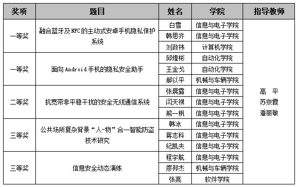 在教务处的统筹安排和信息与电子学院高平、苏京霞、潘丽敏3位教师的具体指导下,经过五个多月的艰苦集训与不懈努力,信息与电子学院白雪、韩思齐,自动化学院邱煌彬、王金戈,计算机学院刘政祎,机械与车辆学院郝以平6名学生获得全国一等奖,信息与电子学院张晨露、闫天祺、熊一枫3名学生获得全国二等奖,信息与电子学院韩冰、蒋志科、纪凯夫、程宇航,机械与车辆学院廖邦杰,软件学院张亮6名学生获得全国三等奖。本次全国大学生电子设计竞赛信息安全技术专题邀请赛的获奖,是我校今年在全国性大学生科技竞赛中取得的又一骄人成绩。