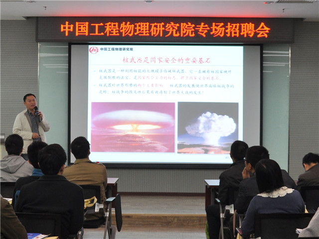 2014年10月12日下午,中国工程物理研究院(以下简称“中物院”)专场招聘会在学校体育馆南厅举办。中物院流体物理研究所、中物院化工材料研究所、中物院激光聚变研究中心、中物院高性能数值模拟软件中心等13家单位参加了本次招聘会。