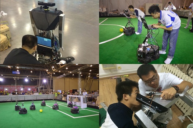 在本次大赛中,机器人中型组项目是一个国际合作项目,以MAS(Multi-Agent System)和DAI(Distributed Artificial Intelligence)为主要研究背景。该项目的最终目标是直至2050年开发出完全自主仿人的机器人队,以期超越人类足球世界冠军队。为了能够作为一支真实的团队进行机器人足球比赛,机器人足球队必须掌握包括智能体自主设计、多智能体协作、策略获取、实时推理、机器人和传感器融合等多种尖端技术。我校机器人足球队Robit已经连续四次参加该项目的比赛,并在此次比赛中与多支具有国际水准的球队竞技比拼,在规定项目和自选项目上均获得了一等奖。此优秀的成绩保持和延续了去年我们已取得的佳绩。