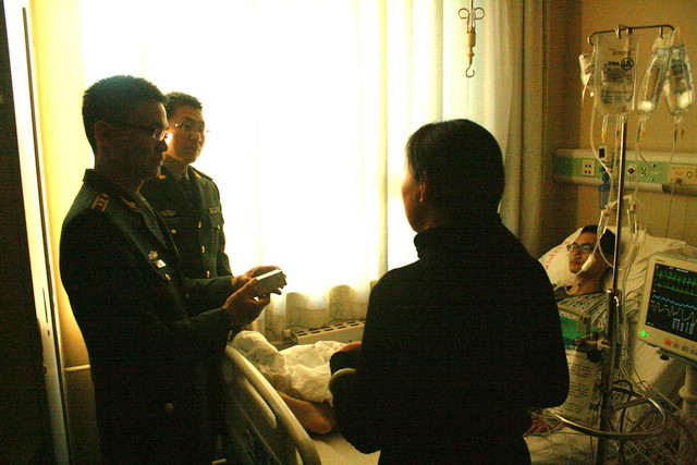 1月29日下午,选培办干部带着营养品和慰问金亲自到人民医院看望了生病住院的奚荣平同学。奚荣平同学系2013级信息工程专业国防生,平时学习勤奋、训练刻苦,曾经晕倒过三次,但始终坚持,从未请假,按要求全部完成了学习训练任务。选培办干部向其母亲转达了大学和部队领导的关心和问候,详细了解了病情和家庭状况,对其在病床上坚持学习的精神给予了高度赞扬,鼓励其积极治疗、安心养病,争取早日康复,并安排国防生骨干轮流陪护。
