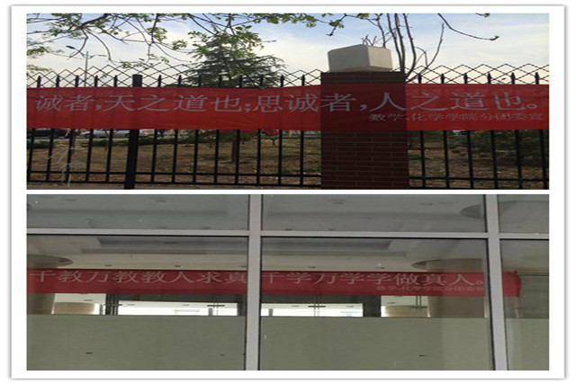 系列活动之三:“千教万教教人求真,千学万学学做真人”数学学院与化学学院联合举办诚信宣传活动。著名教育家陶行知先生说:“千教万教教人求真,千学万学学做真人”,道出了做学问、做教育的本质——真。人文的“真”即为“诚信”。《孟子·离娄上》中有言:“诚者,天之道也;思诚者,人之道也”。诚是自然规律,追求诚是做人的规律。在良乡校区显要位置设置横幅,利用微信公众号推文宣传教育,时时刻刻提醒学生学术诚信的重要性。