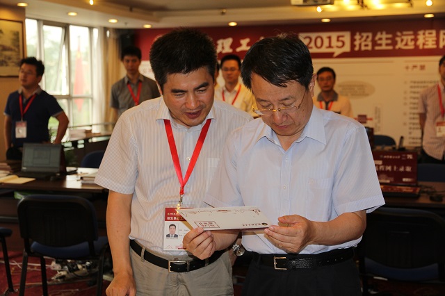 张炜书记和胡海岩校长还分别饶有兴致地审阅了招生录取工作人员上岗考试试卷和录取工作责任书、招生录取工作手册、各省招生宣传单页、2015年新生录取通知书及新生入学须知等资料,并对本年度招生宣传工作的深入细致、招生录取准备工作的严格审慎、招生工作程序的规范周密、为考生家长服务的体贴入微给予了高度评价,并与全体录取工作人员合影留念。