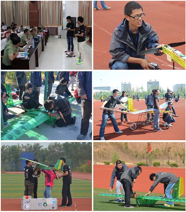 本次比赛分为竞技项目和创新评比两个大类。在校团委、教务处、实验室与设备管理处等单位的大力支持和指导下,由宇航科技创新实践基地42名同学组成的参赛队代表学校分别参加了“限距载重空投”、“太阳能飞机”、“电动滑翔机”、“对地侦察”、“嫦娥奔月”、“垂直起降载运”和“限时载运空投”七个竞技项目的比赛,并提交了4件创新作品参加创新评比。参赛队员虽然来自宇航、机电、物理、计算机和基础等不同的学院,但大家都为了同一个目标,在赛场上努力拼搏。