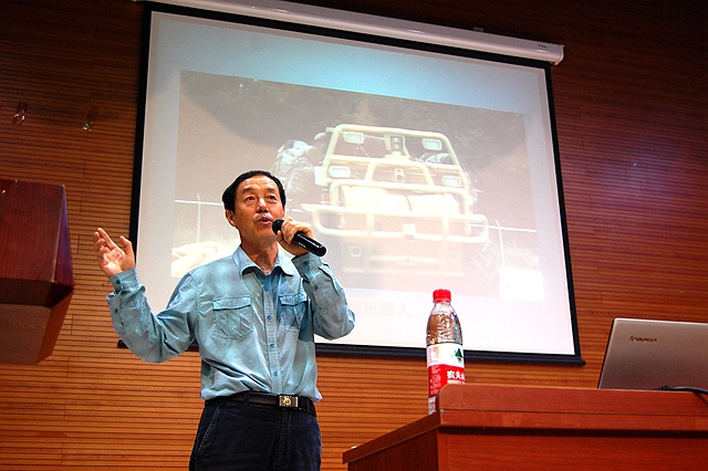 陈晓东老师在非致命性武器、反恐特种警用装备、防护装备等方面有较深入研究,此次讲座,他从反恐机器人的总体概况介绍,通过详尽的数据和视频,全面展示了俄罗斯、日本、美国、中国等国内外机器人发展情况,介绍了各类型机器人在侦查、作战、保障、伴随等方便各自的特点和关键技术内容,以丰富详细的案例、具体的实物模型、诙谐幽默的语言使同学们认识到机器人在军用方面日益凸显的重要性。