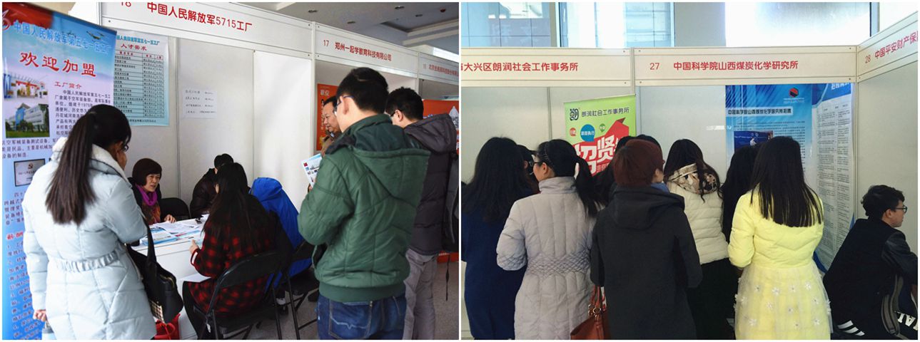 2015年12月15日上午,我校在良乡校区工业生态楼一层大厅举办了“文科及基础学科专场招聘会”。中国人民解放军5715工厂、中国科学院山西煤炭化学研究所、中国物业管理协会、新东方教育科技集团等28家单位参加了本次招聘会,为我校毕业生提供近千个就业岗位。