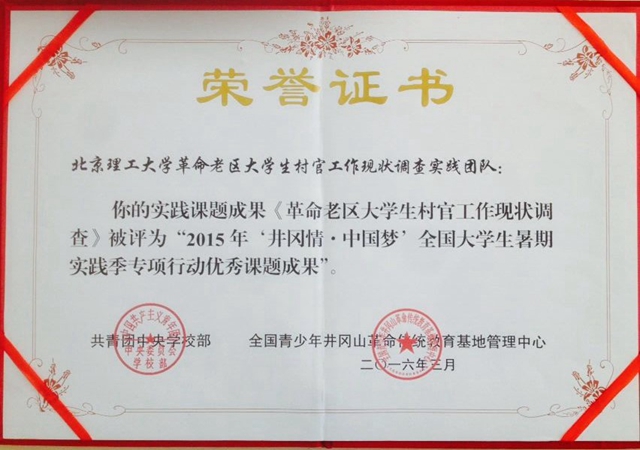 日前,共青团中央学校部、全国青少年井冈山革命传统教育基地管理中心举办的2015年“井冈情·中国梦”全国大学生暑期实践季专项行动表彰活动圆满结束。我校实践团队从全国180多所高校的众多团队中脱颖而出,获“优秀课题成果”奖和“优秀实践团队”荣誉称号,课题成果得到了团中央书记处书记傅振邦的高度评价。