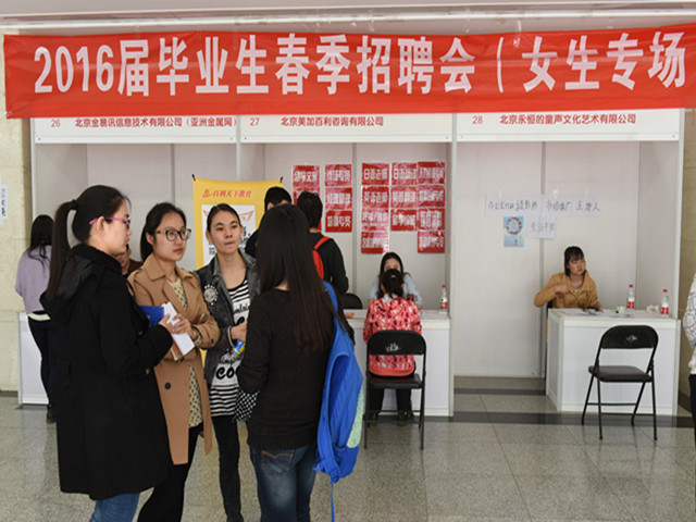 2016年3月30日下午,我校在体育馆南厅举办了“2016届毕业生春季招聘会(女生专场)”。北京航天数控系统有限公司、安永(中国)企业咨询有限公司北京分公司、天津电气科学研究院有限公司、麦可思数据(北京)有限公司、人人网等44家单位参加了本次招聘会。