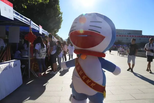 学长们不顾烈日高温,扮演哆啦A梦玩偶与新生互动,成为今天全校整个迎新现场的最大萌宠。