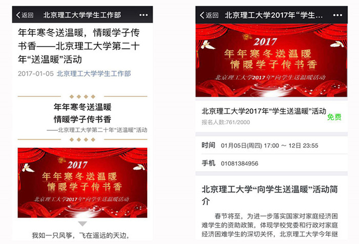 今年继续采取微信报名的方式,报名从1月5日至12日共8天时间,收到报名学生747人,学生事务中心经过严格的审核与筛选,最后符合申请条件的共计600人,发放火车票补助资金共计175734.6元。 1998年,学校首度为家庭经济困难学生发放具有北京特色的慰问品,以此来表达对学生及其家人的问候和祝福;2002年学校加大工作力度,开始为家庭经济困难学生提供往返路费;2005年开始为部分藏族同学提供回家的往返路费,让他们搭乘青藏铁路回到雪域高原与家人团聚。2007年开始,离退休老干部和无阳斋书画社的书法爱好者们为同学们书写春联。二十年来,学校已为近10000名学生送去了关怀和问候,为7900名学生发放了回家过年的路费,仅此一项活动学校就已投入了285万元经费。今年学校为参加活动的学生送去读书卡,将“建设书香校园”延伸至“建设书香家园”的理念,激发和鼓励学生多读书,读好书,以期达到读天下书知天下事,读万卷书行万里路的理想目标,充分全面地调动学生的阅读兴趣和积极性,丰富学生的假期生活。活动于17日在中关村、良乡两校区分别开展。