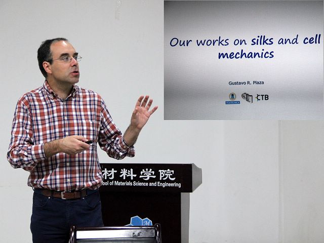 Gustavo教授介绍了其在生物材料,丝素纤维,以及细胞力学等方面的最新研究工作,他创造性地提出了改进的流体纺丝技术并模拟制备出类天然蜘蛛丝性能的纤维,并讨论了运用micro-aspiration技术研究不同细胞的力学性能。Gustavo教授报告内容详尽且异常精彩,对研究生及科研人员的学术生涯深有启发,激发了与会师生浓厚的兴趣并进行了热烈讨论。