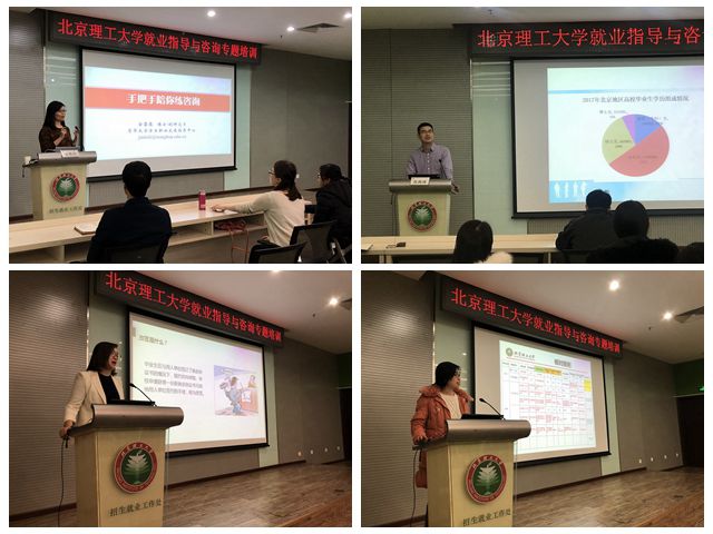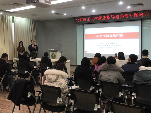 本次培训特邀清华大学学生职业发展指导中心副主任、副研究员金蕾莅主讲。金蕾莅曾获首届全国高校就业指导课程教学比赛特等奖,现为教育部《高校就业指导骨干教师高级研修班》讲师,亚太职业生涯发展协会(APCDA)中国区负责人,具有丰富的就业指导与咨询的经验。金老师从世界一流大学就业指导与咨询的发展新趋势入手,结合自身的就业咨询实践体会,向参加培训的老师就如何开展面向学生的生涯规划咨询传授经验。此次培训还邀请了北京市教委学生处张海涛主任,为老师讲解国家就业政策,尤其是北京市最新就业政策和各种就业手续办理注意事项;学校就业指导中心副主任管帅华、王卓分别结合学校相关就业政策及2018年春季毕业生派遣的具体安排进行了详细介绍。