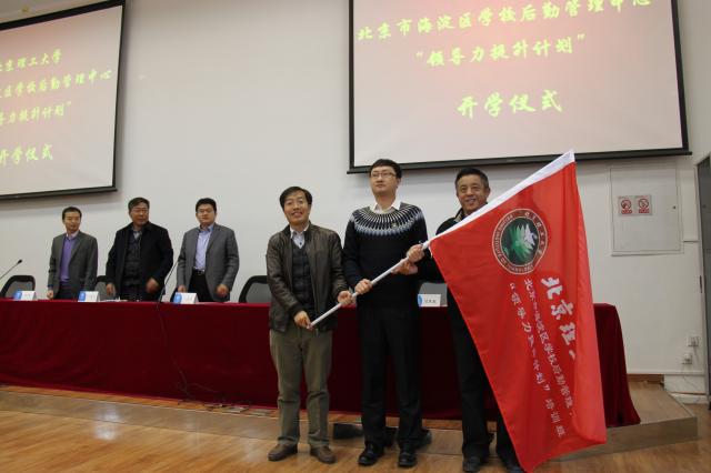 张博生与吴水龙为学员代表授予班旗,2018年度北京市海淀区学校后勤管理中心“领导力提升计划”培训班正式开班。